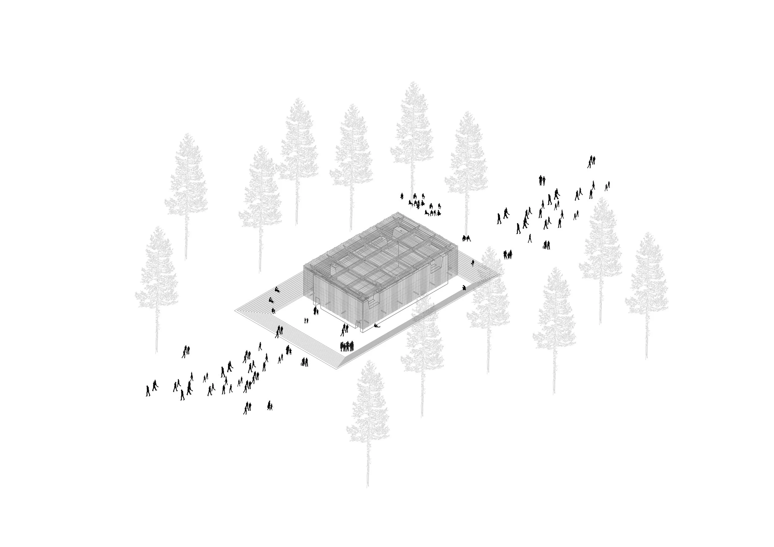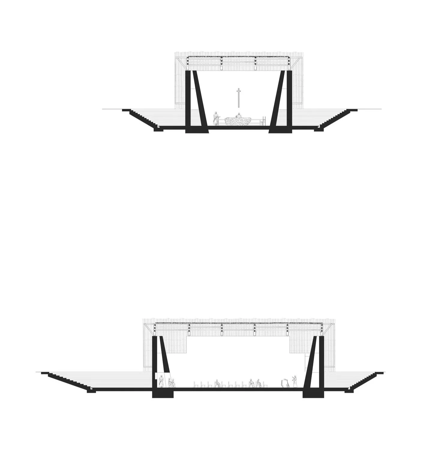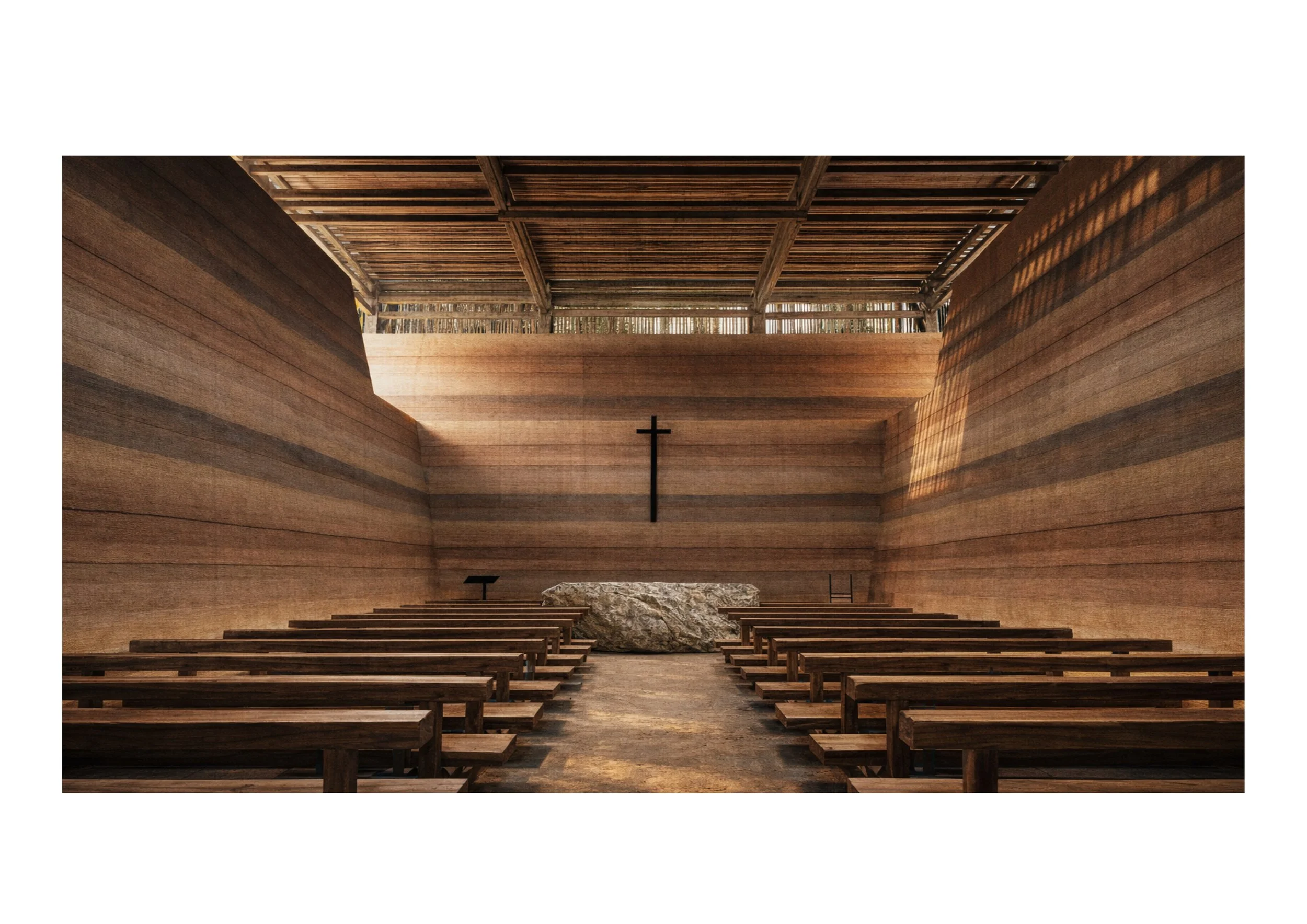 The final layer is defined by a lightweight timber roof structure resting on the solid earthen walls. The raw wooden façade and exposed structural system introduce warmth and material contrast while remaining deeply rooted in local construction traditions. The chapel integrates seamlessly into the surrounding landscape, extending its relationship to the land and establishing itself as a nurturing communal anchor for the Rukomo community.
